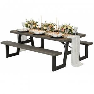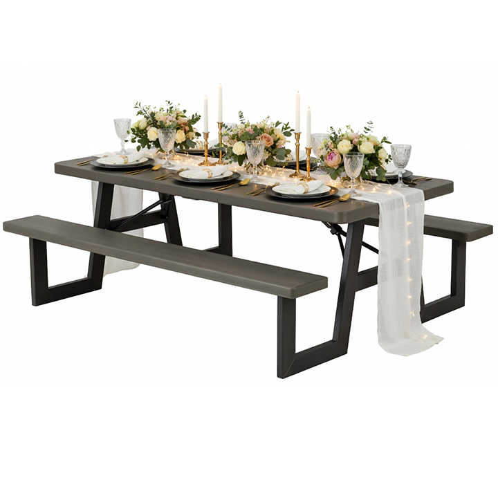 This sturdy 72-inch rectangular picnic table is a reliable and popular choice for outdoor events. Perfect for weddings, corporate events, parties, festivals, picnics, and outdoor gatherings, it comfortably seats 4-5 guests and provides a clean, modern look that blends well with a variety of event themes.Constructed with a durable polyethylene tabletop and benches in an attractive brown slat pattern. The strong steel frame in bronze finish offers excellent stability while maintaining a sleek appearance.Specifications - Length: 72 Inches